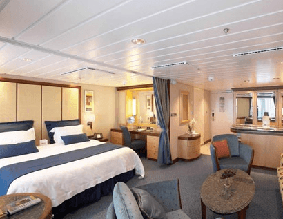 ロイヤル・プロムナードを見渡す2つの湾曲した窓をお楽しみください。ベッド:ロイヤルキングサイズベッドになるツインベッド2台、ダブルソファベッド1台、プルマンベッド2台。広さ340平方フィート。