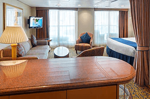ご家族で広々とした空間から素晴らしい景色をお楽しみください。ベッド:ロイヤルキングサイズになるツインベッド2台、ダブルソファベッド1台、プルマンベッド1台とツインベッド1台、またはプルマンベッド2台。客室面積:265平方フィート。