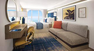 バスタブと洗面台2つを備えたフルバスルーム、リビングルーム、座席とダイニングスペースのあるプライベートバルコニー付きの1ベッドルームスイート。ツインベッド2台はキングサイズベッドに変換可能。リビングルームにはダブルソファベッドあり。ドライバーエリアと化粧台付き。
