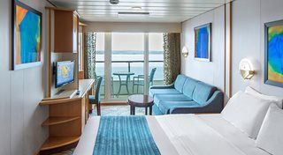 ツインベッド 2 台 (クイーンサイズ ベッドに変更可能)、ソファーベッド付きのリビングエリア、バスタブ付きの専用バスルーム、専用バルコニー、バルコニー: 107 平方フィート。