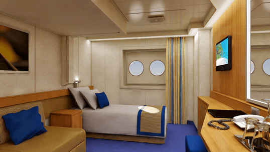 ツインベッドと上段ベッド1台。ソファとコーヒーテーブル。デスクと椅子。シャワー付きバスルーム。クローゼット3つ。舷窓2つ。専属のルームスチュワード。柔らかく心地よいリネン(カーニバル・コンフォート・コレクション)。貴重品用の室内金庫。十分なクローゼットと引き出しスペース。テレビ。客室内空調。バスローブ(リクエスト制)