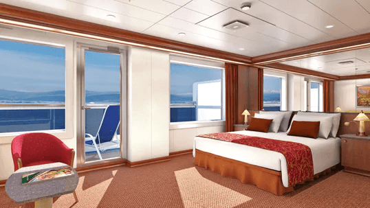 ツインベッド 2 台 (キングサイズに変更可能) とダブルソファベッド。ソファ、アームチェア、コーヒーテーブル。デスクと椅子。シャワー/ジャグジーバス/ビデ/ダブルシンク付きのフルバスルーム。ウォークイン ドレッシングエリアには化粧台 (および小型シンク)、椅子、十分なクローゼットスペース。パティオチェアとテーブル付きの大きな専用バルコニー。優先チェックインと搭乗。一部の専門レストランでの優先ディナー予約。優先メインダイニングルームの時間指定 (アーリー、レイト、またはご都合の良い時間でのダイニング)。すべての港での優先下船。大型ボトル入り飲料水 2 本。ピロートップマットレス。バスローブ。専属ルームスチュワード。柔らかくて心地よいリネン (カーニバル コンフォート コレクション)。貴重品用の室内金庫。十分なクローゼットと引き出しスペース。テレビ。客室の空調