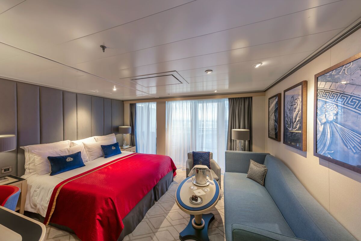 バルコニードア近くにラウンジスタイルのリビングエリア、寝室とリビングスペースが独立した寝室、ベランダへのアクセスを備えたスイート。ツインベッドはキングサイズベッドに変更可能。リビングエリアにはソファとコーヒーテーブル、バスルームにはバスタブ、シャワー、収納付き洗面台が備わっています。