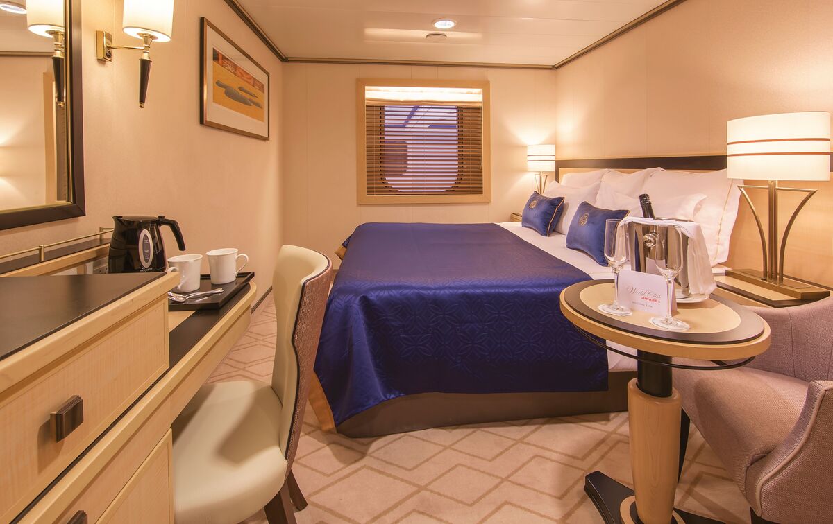 中央アトリウムを見渡せる内側客室。コンパクトながら寝室とリビングスペースを備え、船上での静かで快適な滞在をお約束します。 - ツインベッドはキングサイズベッドに変換可能 - 船のメインホールを見渡せる内側窓 - ワードローブとベッドサイド収納の近くにライティングデスクを完備