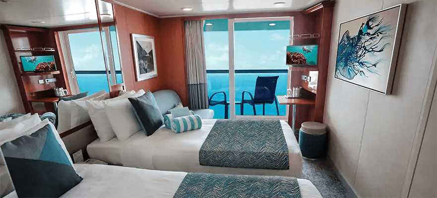 最大 4 名様までご宿泊いただける十分なスペースを備えた客室を隅々までお楽しみいただけます。下段の 2 つのベッドはクイーン サイズ ベッドに変換でき、ソファーベッドを引き出してさらに 2 名様がご宿泊いただけます。また、シッティング エリアと、プライベート バルコニーに通じる床から天井までのガラス扉もございます。客室は船尾に面しているため、バルコニーからの眺めは素晴らしく、忘れられない思い出となることでしょう。