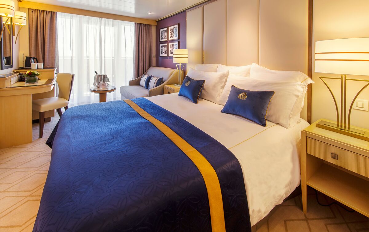 シンプルなモダンスタイルのオーシャンビューステートルーム。大きな窓からは海を眺めることができ、寝室とリビングスペースが一体となったレイアウトです。ツインベッドはキングサイズベッドに変換可能。大きなガラス窓からは日中、海の景色を楽しめます。コンセントと鏡の横にはライティングデスクが設置されています。